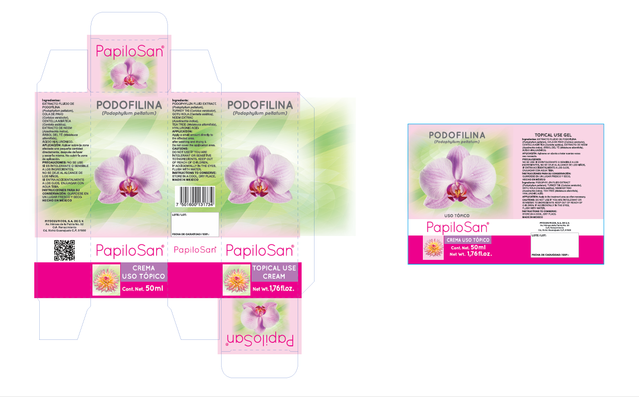La PODOFILINA (podophyllum peltatum) es una Resina extraída de la raíz de la mandrágora o manzana de mayo cuyo componente importante (10 a 40%) es la podofilotoxina. Cuando se aplica en forma tópica impide la división celular y su acción provoca muerte y erosión del tejido. Este efecto explica su utilidad en el tratamiento del condiloma acuminado y de otras verrugas. Una parte de la podofilina se absorbe desde el sitio de aplicación, y la absorción aumenta cuando se administra en lesiones friables, sangrantes, sobre la piel sana o sobre mucosas. Se utiliza en tratamiento tópico de tumores epiteliales no malignos como papilomas o fibrosis. De uso tópico también, se utiliza en el tratamiento de verrugas genitales, condiloma acuminado y verrugas perianales.